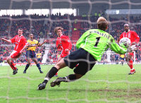 His low cross was nudged by Overmars and Kanu neatly side-stepped Gordon