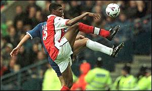 "If he was just a show-off it would be different," Wenger pointed out after the match. "But he is a winner first and foremost. You can call Kanu an efficient player because he always does things to win games. This man is not just a talent but a fighter. His character means that he fights every minute he is on the pitch. Sometimes, when he dribbles, I actually think opponents cannot see where the ball is." Kanu enjoyed the moment, but not in the manner of someone who was pleased for himself. "When the players all reacted the way they did to me, they knew it was a good goal. But they, and I, knew how important it was for the team. Whatever you do, whatever conditions you play in, it is not just about talent, it is about being professional - working hard and dedicating yourself to the team. "Having said that, this was one of the best things I have done. The third goal was not instinct, I did think about what to do. I was never going to cross but I thought I would try my luck because there was no keeper on the front post. From the instant I went past Ed de Goey, my mind was on how to score. There were two men on the line, I knew that, but I believed that even if I mis-hit it, at worst, then it might create something." It had been an exceptional performance from Kanu all afternoon. Early passes into space, mazy intricate dribbles in midfield and penalty box play with his back to goal that any striker would be proud of. At least twice he drew lunging tackles from Marcel Desailly and Frank Leboeuf, only for the Frenchmen to realise they had been duped by the footballing equivalent of the three card trick - wherever they thought the ball was Kanu knew full well it was not there. The first goal came when he controlled Marc Overmars' shot and poked it past De Goey. Then, Kanu created the second with a wonderful volley pass to Overmars before taking a return pass, cutting past Desailly to the right, and striking a vicious shot past the Dutch keeper. Then came the pièce de resistance. |